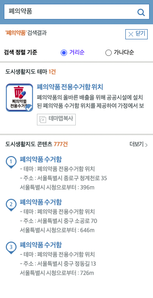 2) 도시생활지도 테마 의 폐의약품 전용 수거함 위치를 선택하고 본인의 집 근처로 위치를 조정해 주세요.